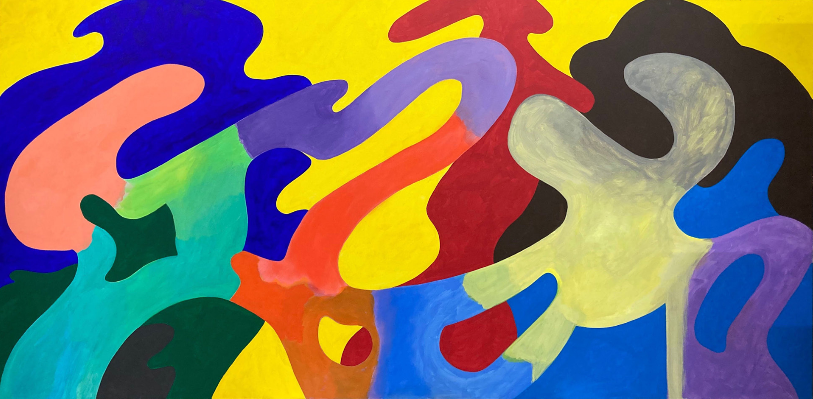 Sur le sol comme sur les murs, toiles, tapis, sculptures, mobilier : tout ici ou presque est expression du maître des lieux. Des dizaines de maquettes, de cartons et de papier, d'esquisses peintes ou non, témoignent de la recherche d'une forme en deux ou trois dimensions. La maquette d'une sculpture est posée sur une gouache qui inscrit l'ombre projetée de la sculpture qui deviendra un pavement tout en serpentine. Des maquettes de papier, posées là, sont autant de lampes à venir : mais une ou quatre, se demande-t-il ? Les couleurs claquent, vives et chaleureuses, elles habillent, le métal, la toile, le papier, ou le carton. Les toiles sont retournées et seule l'une d'entre elles, une de ses anciennes toiles, rachetée récemment par un particulier, posée contre un mur, sur un rebord est en train d'être restaurée par ses soins. Pas de chevalet. Les murs, les sols sont les pages blanches de ce plasticien qui passe avec bonheur de l'horizontale à la verticale.