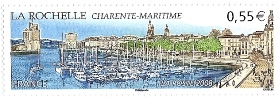 La Rochelle a été dessinée deux fois : dans la série touristique de 1930 avec ses deux tours chères à Richelieu et en 2008 par un timbre très allongé montrant le bassin de plaisance et, dans le lointain, on y devine les deux fameuses tours.