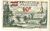 De deux villes principales partaient ceux que cette nouvelle terre attirait : Saint-Malo a été timbrifiée en 1938 à 20 F, repris en 1940, surchargé, 10 F au lieu de 20.