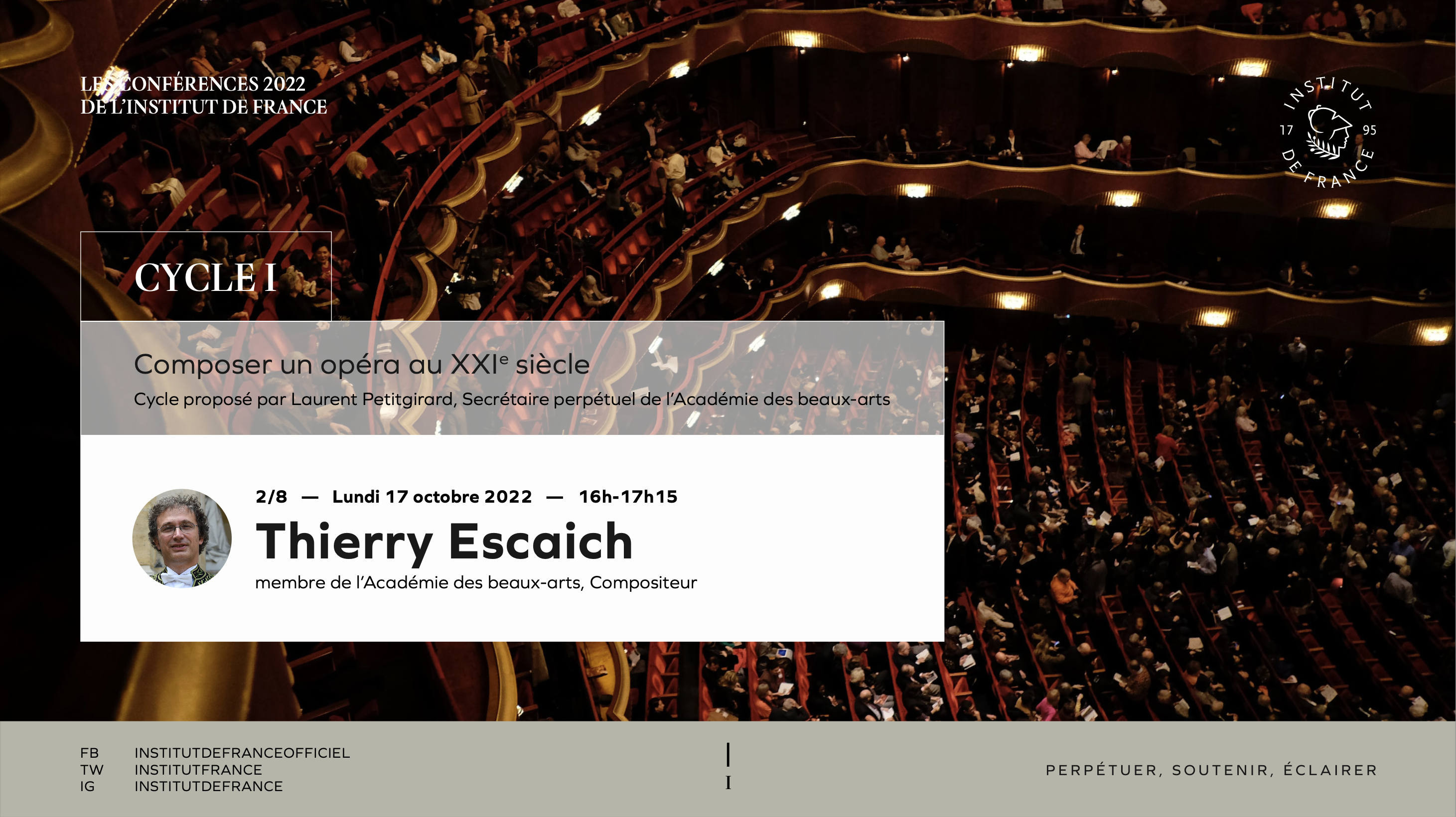 Thierry Escaich, compositeur et membre de l’Académie des beaux-arts, revient sur sa rencontre tardive avec l’opéra. Selon le compositeur, ce genre musical permet de confronter différentes cultures, qu’il convient d’enrichir en mélangeant les styles et en leur donnant de l’espace sonore. Avec ses créations Claude, Shirine et Point d’orgue, il cherche les moyens de mettre en relief les thèmes abordés, par exemple l’enfermement, tout en leur donnant une portée universelle. Il croit fermement à l’avenir de cet art protéiforme, parfaitement adapté à notre temps.