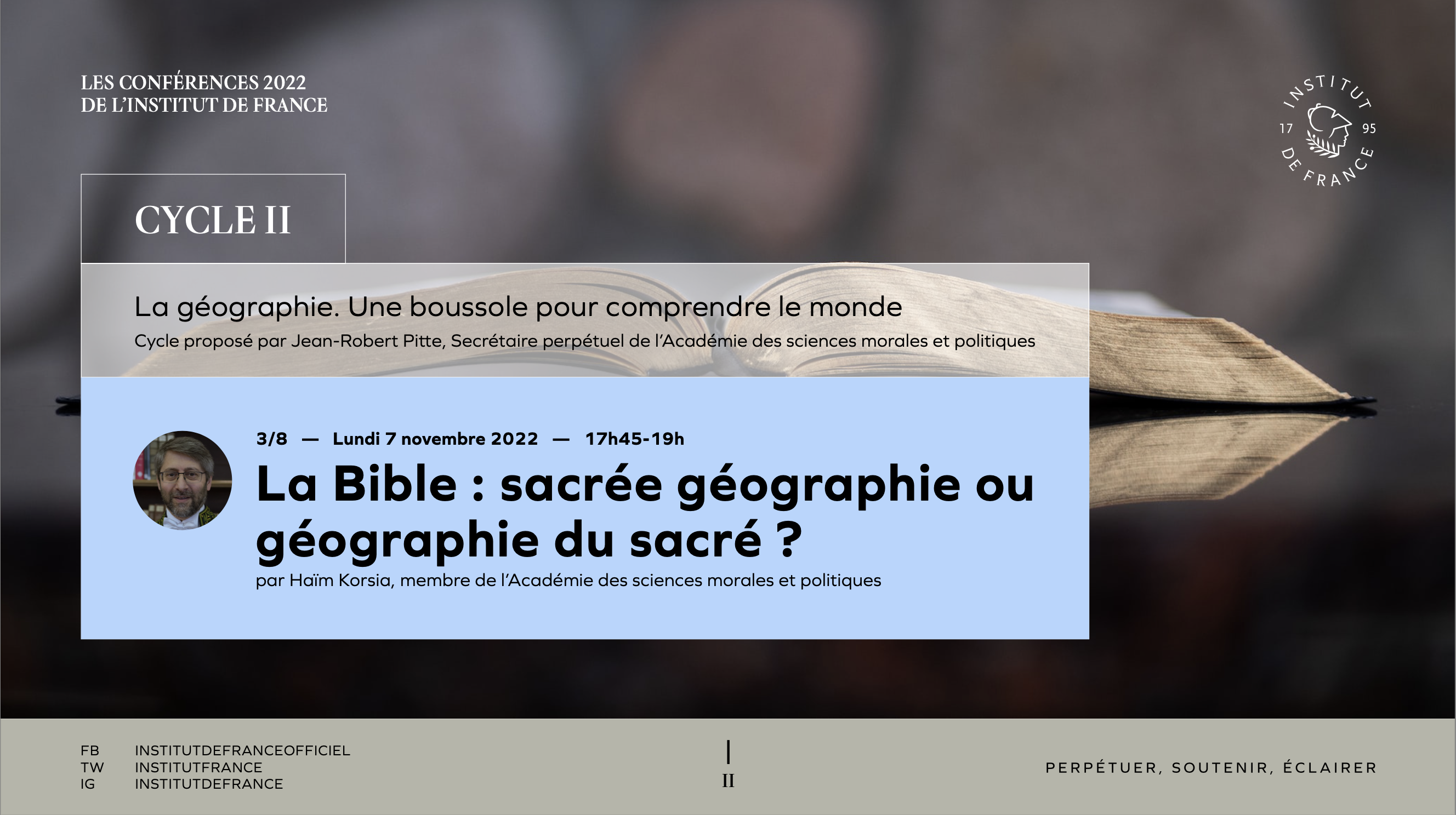 Haïm Korsia, membre de l’Académie des sciences morales et politiques, commente la symbolique des éléments géographiques dans la Bible. Selon lui, la géographie est la rencontre d’un endroit avec une population qui va le transformer, c’est la rencontre entre l’espérance du bon et celle du beau. Il voit dans l’expérience d’Abraham la promesse que Dieu fait à chacun. Déserts, terres, montagnes et fleuves, autant de milieux confiés à l’homme qu’il doit travailler et non asservir. Choisir la géographie sacrée dans la Bible, c’est choisir la Vie.