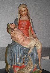 Aussi lorsque la tunique se déchire, c'est la Chrétienté qui perd son unité Au lendemain du Grand Schisme (1378), le Fils martyrisé descendu de la Croix succède à l'Enfant Jésus sur les genoux de sa Mère. Les Pièta montrent la Vierge douloureuse devant tous les malheurs du temps tandis que le Stabat Mater et les lamentations montent des cœurs transpercés. Les douleurs remplacent les joies dans les litanies et les théologiens commentent la communication de la Passion entre la Vierge et son Fils. En Marie, clé de voûte de la Chrétienté, la fin du Moyen Âge essaie de trouver alors son ultime sursaut d'indivision. Ses miracles et ses apparitions s'y emploient, en particulier dans les controverses autour de sa Conception Immaculée qui menacent plus que jamais l'unité de l’Église. Son visage sans tâche rayonne sa beauté pure sur les tableaux qui imaginent un jardin marial, promesse de paradis offerte à tous les enfers vécus.