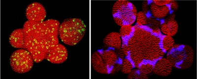 Un grand nombre de lignées transgéniques exprimant des marqueurs, permettent une analyse fine in vivo. Les deux images montrent des méristèmes d'inflorescence vivants, visualisés au microscope confocal. Les cellules sont colorées en orange/rouge. Sur l'image à gauche, des cellules en phase mitotique expriment un marqueur fluorescent jaune. A droite, les cellules expriment un marqueur de la frontière entre le méristème propre et les jeunes boutons floraux